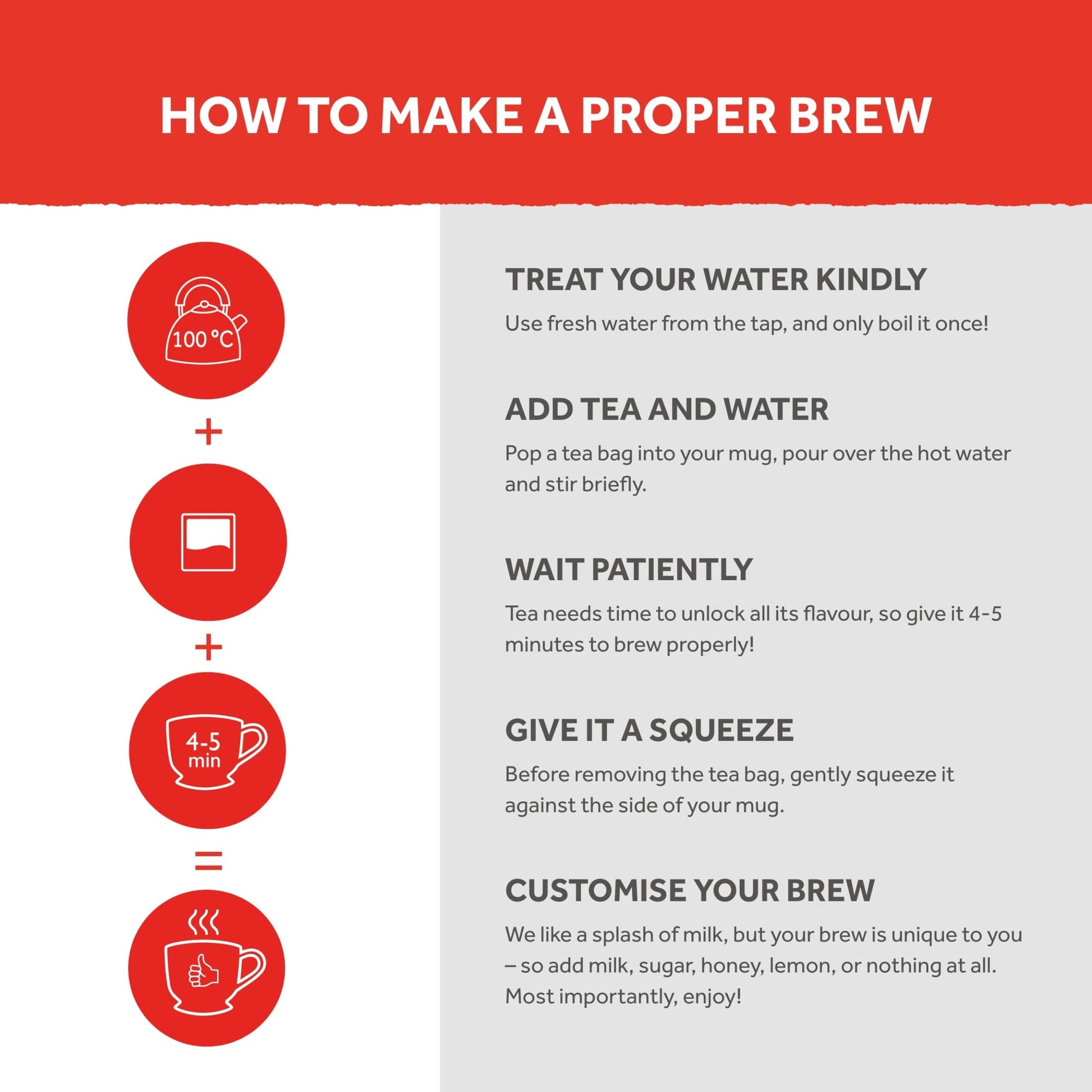 For the perfect cup use one tea bag. Add freshly boiled water and infuse for 4-5 minutes. Serve pure or with milk.
